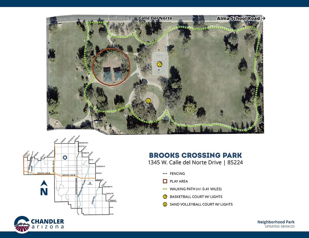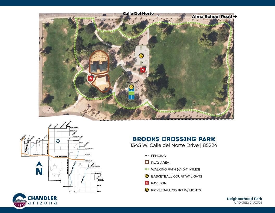 The newly renovated Brooks Crossing park is the best place for your next family outing. With a ton of shaded activities, you can enjoy the fun all year round. Get a good workout in on the various fitness nodes or take a stroll on the walking path around the park. Get your pickle on at the pickleball court or shoot some hoops on the well-lit basketball court. With two play structures kids can run, climb, and slide into a ton of fun. With a large open field you can enjoy a picnic or play a game of soccer with your friends and family. Brooks Crossing park is a great neighborhood park with fun for everyone!