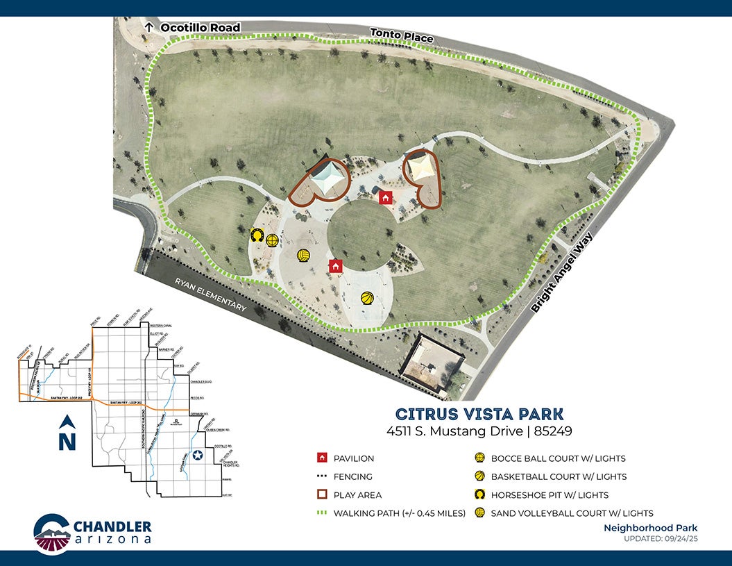 Park-goers will also notice citrus colors of green, yellow, and orange throughout the park on playground equipment, tot-lot, and circular bike racks. A recreation destination this park also features a bocce ball court, basketball court, sand volleyball court, and .45 miles of scenic trails for joggers and dog walkers alike.