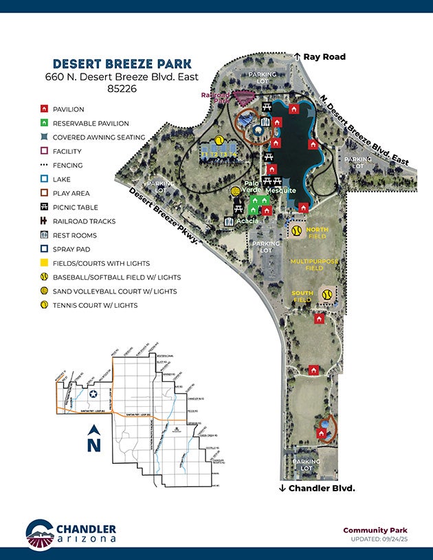 Desert Breeze Park has something for everyone! From sprawling grassy areas to sports fields to shady pavilion and picnic areas, this park is a destination for outdoor lovers of all ages. The lake is a peaceful place to enjoy fishing or watch the resident ducks paddle by. The park boasts a multi-use field, tennis courts, diamond fields, and a volleyball court. Walking paths wind around the lake and through the park, dotted with several shady pavilions to take a break. Don't miss the Hummingbird Habitat to see native plants that attract local pollinators.