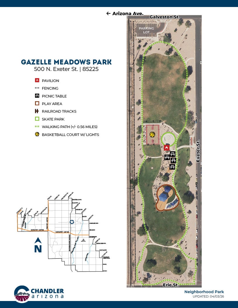 Located in the heart of downtown Chandler, Gazelle Meadows Park is a classic neighborhood park that’s a great place to enjoy a scenic walk or reconnect with family and friends. The 9-acre park features .56 miles of scenic walking paths, a playground, picnic areas, and vibrant greenbelts.