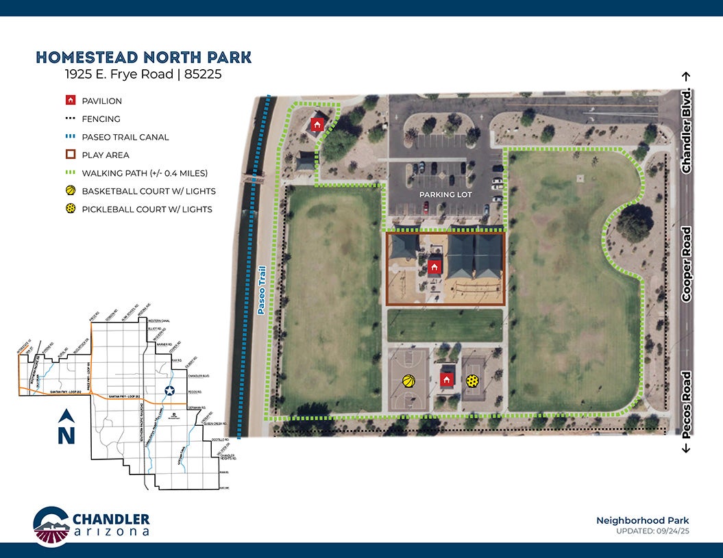 Chandler’s 69th park, located along the Paseo Trail and Consolidated Canal, Homestead North is a uniquely themed park that is fun for all ages. With train station and mine themed playgrounds the creativity and fun never ends. Equipped with climbing structures, ziplines, and swingsets there is so much to enjoy. Bring out your competitive side on the pickleball and basketball courts or get a quick workout in on the fitness equipment. There is also a large open field to enjoy a picnic or stroll around the park.