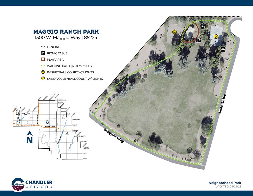 Maggio Ranch park is a great neighborhood park with a large grassy field, playground, walking trails, sand volleyball, and a basketball court. The grassy field is perfect for your next picnic or a game of soccer. Take a quick walk on the 0.35 miles of walking path around the park. Enjoy the shaded play area or play a fun game of sand volleyball or basketball on one of the courts. Maggio Park has something for everyone to enjoy!
