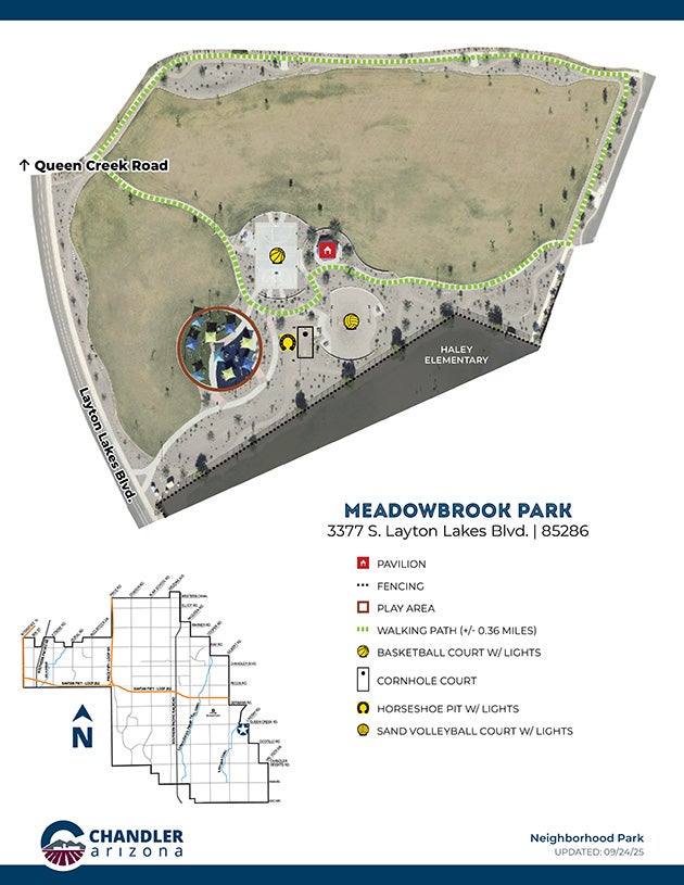 Meadowbrook Park is far from your typical park, offering a unique blend of physical activity and fun. It features a variety of structures designed to help you build strength and test your skills in an exciting way. The Ninja Warrior style of the park allows you to challenge yourself with parkour, climbing, and swinging obstacles. In addition to these fun features, you'll find a basketball court, sand volleyball pit, horseshoe area, and cornhole boards to cater to all interests. The spacious grassy field is perfect for running around, having a picnic, or enjoying a family outing. For a more relaxed pace, take a stroll on the 0.36-mile walking path that loops around the park, or unwind in the shaded pavilion area. Meadowbrook Park a unique spot for your next family adventure!