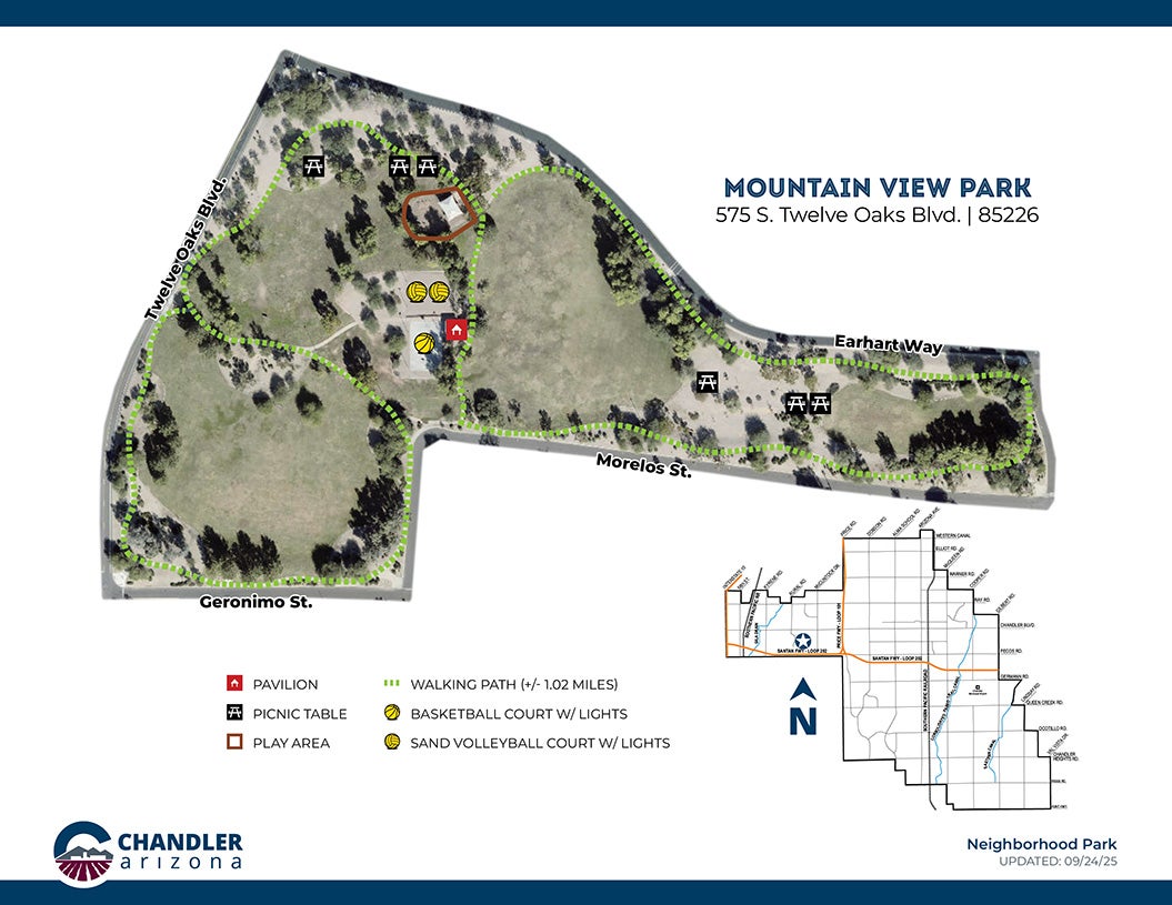 Mountain View Park is an expansive park here in Chandler. With just over a mile of walking path surrounding the park you can get a good walk in while enjoying the beautiful greenery of the park. Feeling competitive? This park is equipped with two sand volleyball courts and a basketball court so you can get your game on! Have a quick picnic at one of the picnic tables or hangout on one of the four large fields. Come play around on the play structure the has many slides, climbing features and even a monkey bar course where you can test out your strength while having fun.