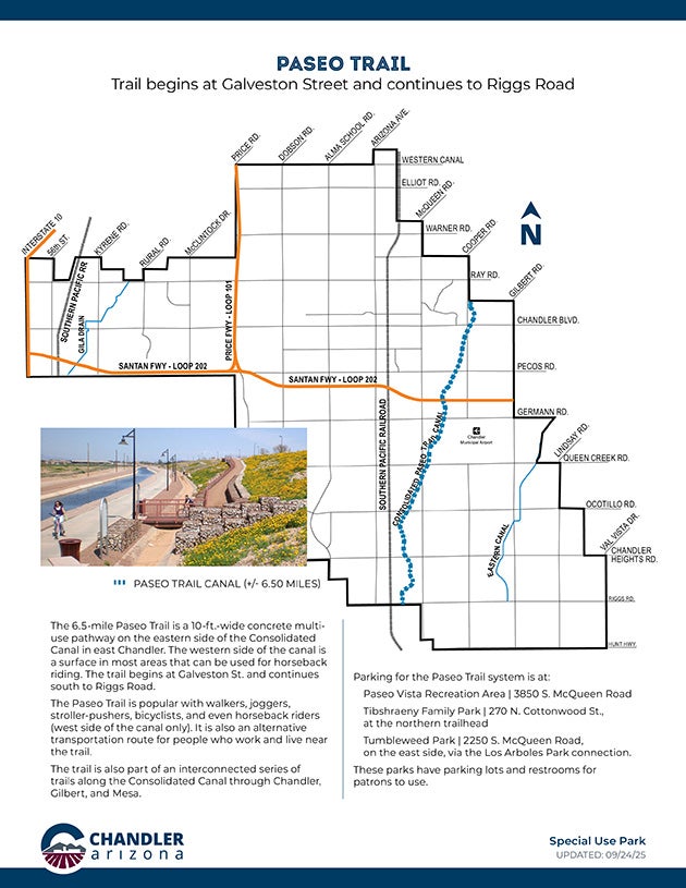 The 6.5-mile Paseo Trail features a 10-foot-wide concrete multi-use pathway on the eastern side of the Consolidated Canal. The western side of the canal is an unimproved dirt surface that can be used for horseback riding or bicycling. The Paseo Trail's first phase opened in 2001, and it has become very popular with walkers, joggers, stroller-pushers, bicyclists, and even horseback riders on the west side of the canal.