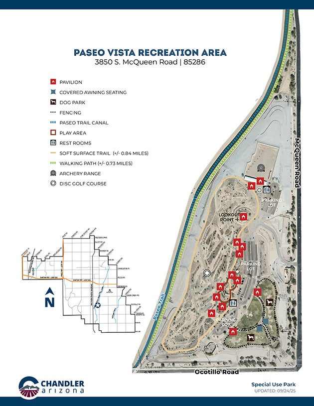 Paseo Vista Recreation Area is not your typical park! Located along the Paseo Trail Canal this recreation area features a variety of activities you won't find at just any regular park. With an 16 basket disc golf course, archery range, dog park, plenty of pavilions, play structures for the kids, and two different walking trails there is something for everyone to do. Enjoy the 0.73 mile walking path on the Paseo Trail or take a lap around the park on the 0.84 mile soft surface trail on the outer edges of the park. With two different play structures, kids can enjoy their time sliding, swinging, running, and climbing. Paseo Vista is a unique destination for your next adventure or family outing, with something for everyone to enjoy!