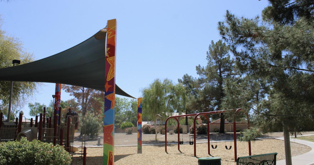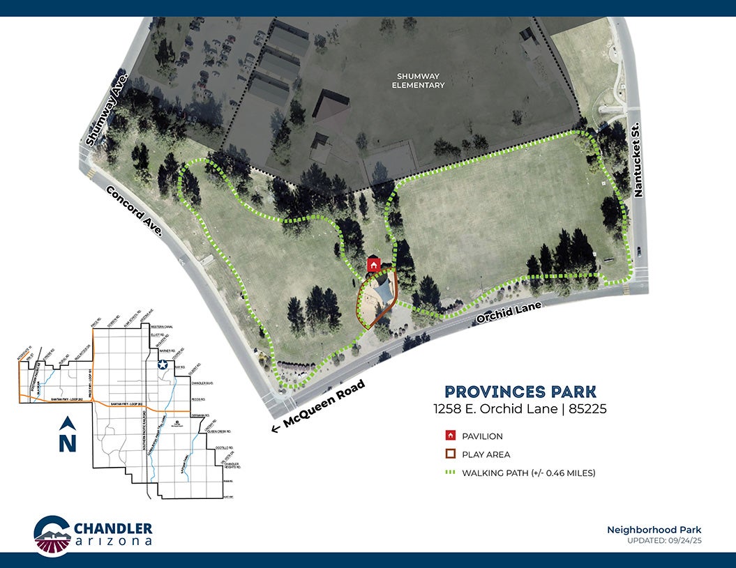 Provinces park is a small neighborhood park in Chandler. With about 0.5 miles of walking path around the parks, and two large fields there is so much to enjoy. The small shaded play area features slides, climbing features, and a swing set. Thispark also has unique artwork on the poles that hold up the shade covers for the play area. This neighborhood park is perfect for your next family outing.