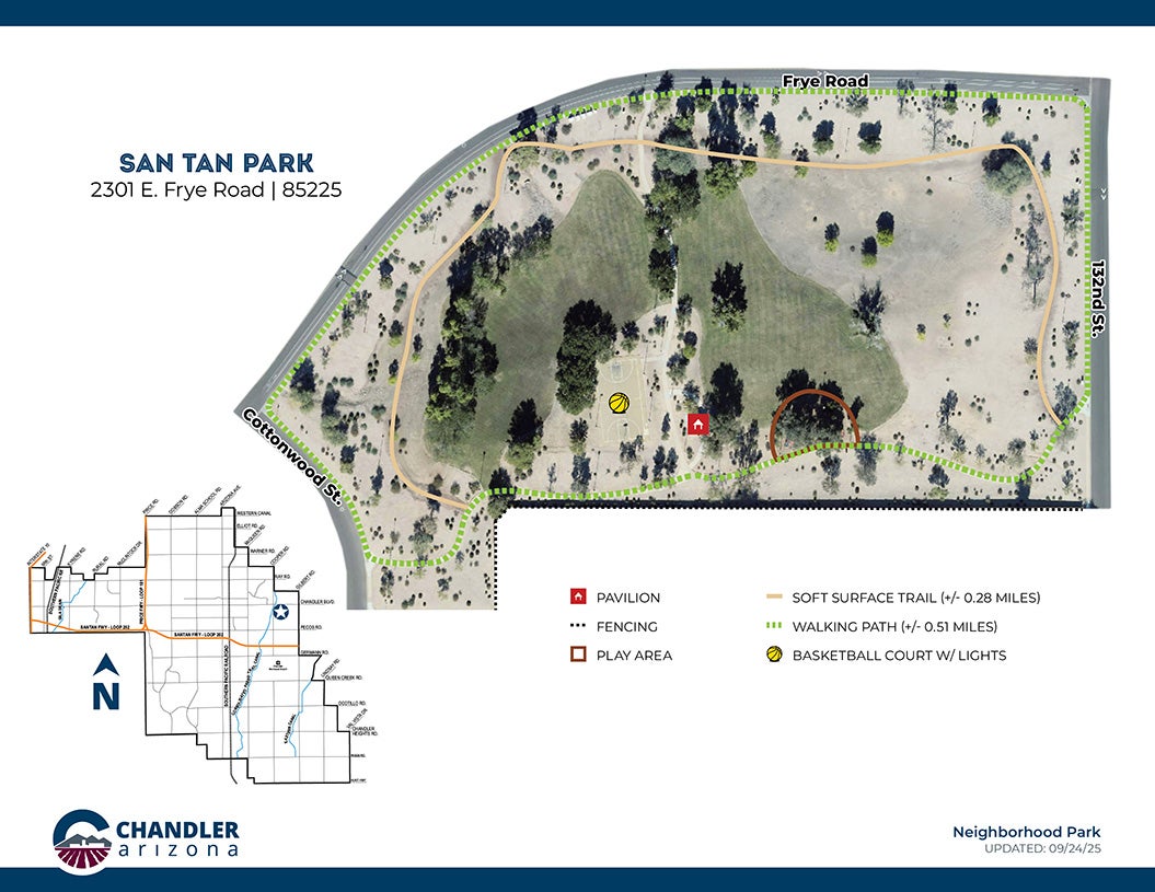 San Tan Park is a spacious neighborhood park for you to enjoy with your friends and family. Enjoy two modern play structures that feature different climbing structures, slides, and various features that will let your child's imagination run wild. Play a game of basketball on the amazing court here. Take a stroll on the walking paths around the park or enjoy the two big fields surrounding the park.