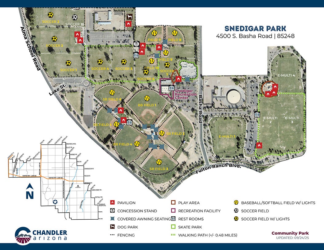 Snedigar Sportsplex and Recreation Center is a 90-acre facility located in South Chandler. The park features one of the country's top-rated skate parks as part of the City of Chandler Parks system, Snedigar Skate Park.