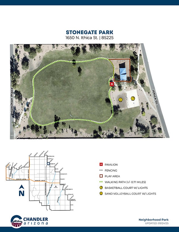 Stonegate park is a large neighborhood park in Chandler. There is 0.71 miles of walking trail for you to get some steps in. Enjoy the large open field and play a game of soccer or enjoy a picnic. Show your competitive side on the sand volleyball and basketball courts. Hangout and play in the shaded play area that features two play structures. Stonegate park is a wonderful place to visit for a day of outdoor fun!