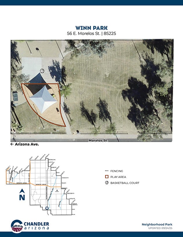 Winn park is a small park located near downtown Chandler. With a large spacious field you can enjoy a picnic or relax under the shady trees. Enjoy the modern play structure with multiple climbing features and slides. Play a game of basketball on the half court, equipped with lighting for you to play into the evening. This small park is a great place for you to enjoy a day outdoors.